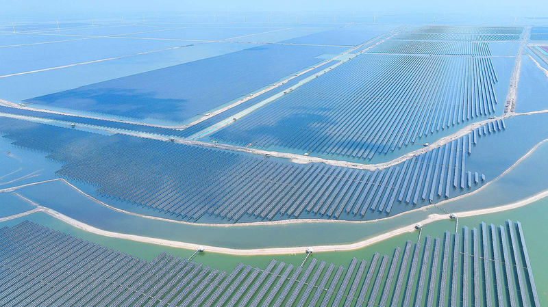 目前,滨化集团研发的具有国际先进水平的2500nm³/h制氢电解槽已通过性能测试。滨州“风光经济”得天独厚,新能源装机规模、发电量均居山东省前列。图为位于沾化区临港产业园的宏烨新能源2gw渔光互补发电项目。