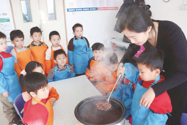 1月6日,沾化区黄升镇中心幼儿园老师带领孩子们一起熬腊八粥、腌腊八蒜,感受浓浓的传统民俗文化,进一步增强孩子们对传统文化的认知。图为老师“手把手”教孩子们熬制腊八粥。(通讯员孟令旭张华摄影)